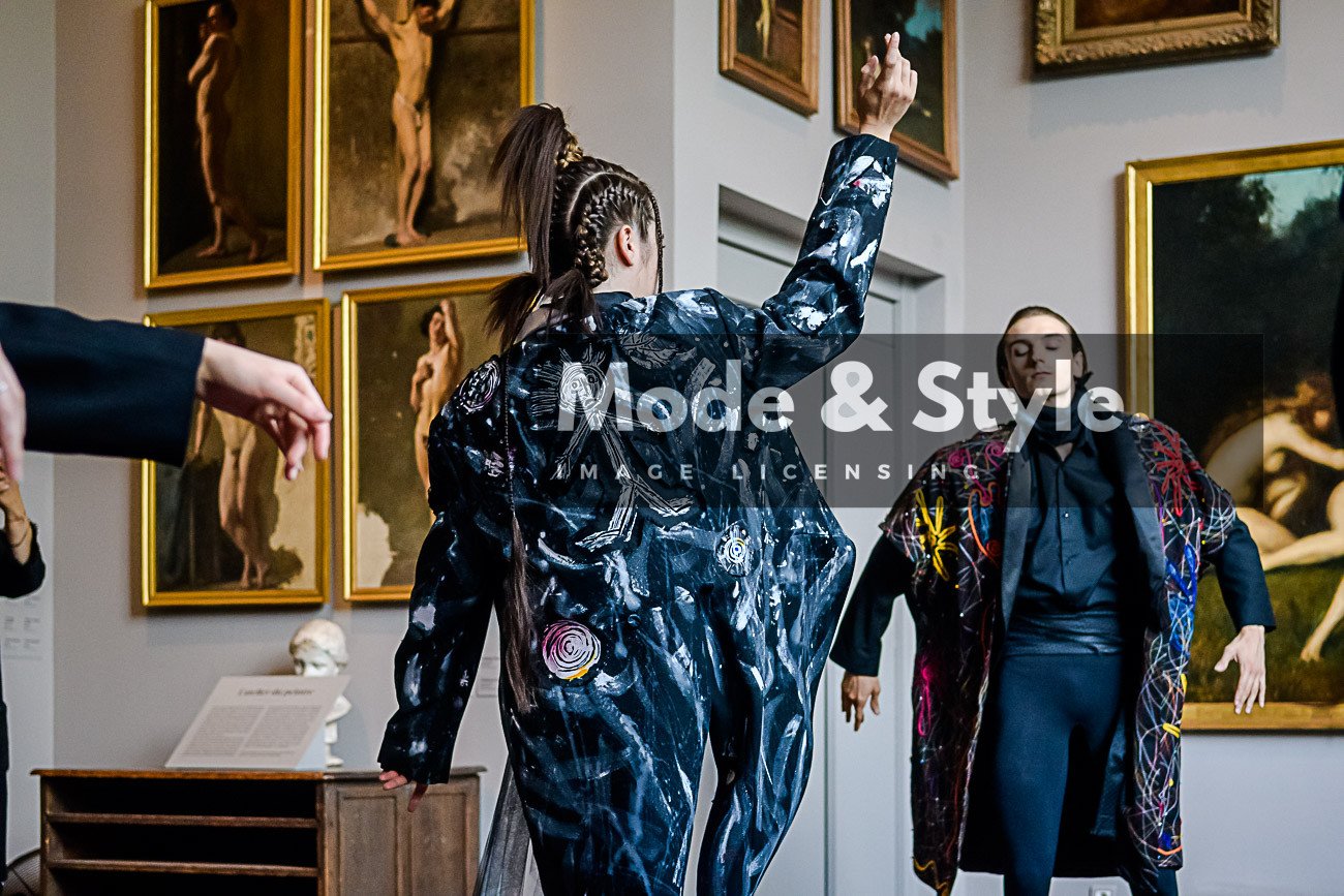 PARIS, FRANCE – JUL 05: A model dancing during the Franck Sorbier Autumn Winter collection, during the Paris Fashion Week on July 05, 2023 in Paris, France.